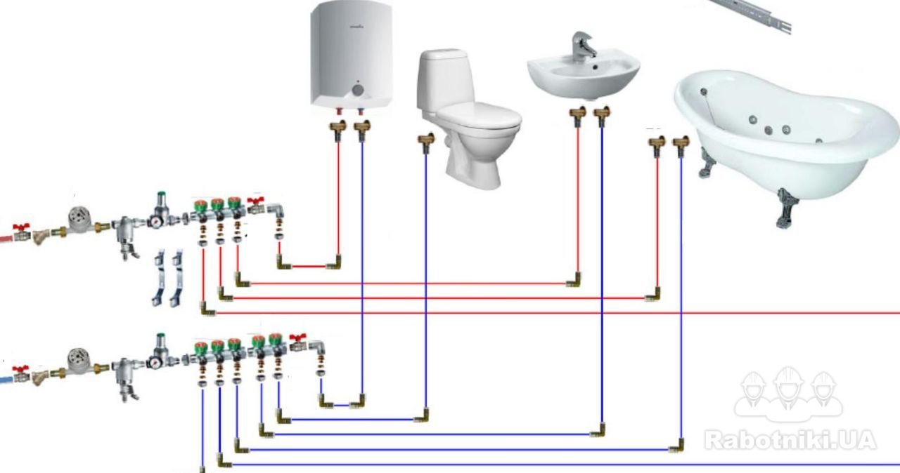 Сантехработы в ванной комнате+ два подключения на кухни. Количество точек подключения ХВС: ст маш., умывальник, инсталляция GEBERIT, ванная, мойка, посудомоечная маш, бойлер (от тройника, который можно поставить с торца коллектора/гребенки). ГВС: мойка, умывальник, ванная и обратка с бойлера на коллектор/гребёнку ГВС. монтаж сантехниши. Pазводку от коллекторов ХВС/ГВС можно выполнить 16- той трубой Rehau Flex, а 20-той от счётчиков к фильтрам грубой очистки (с сетками на 100микрон). Канализацию можно смонтировать материалами производителя Ostendorf. состояние стен: после застройщика, в штукатурке; пол- стяжка.