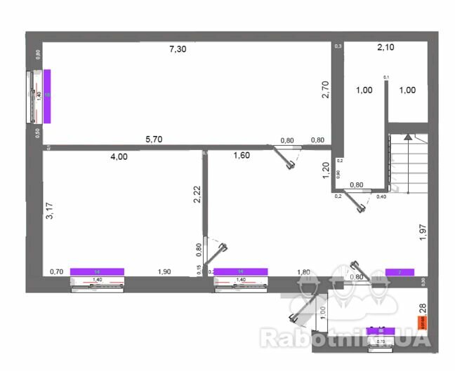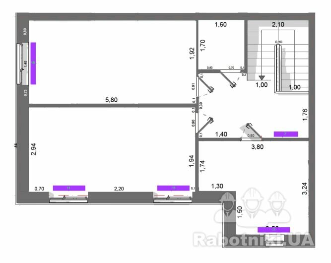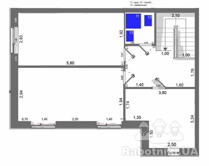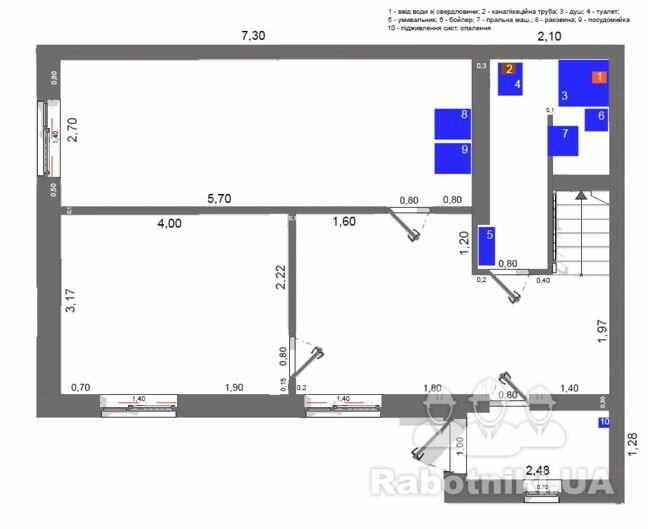 Сантехніка, точки видно на плані, розміщення компактне, відстані мінімальні. Стіни м які піноблок, перекриття між поверхами моноліт 15 см (потрібно просверлити). В будинок заведено, каналізаційну трубу, заведено зі свердловини трубу і кабель, додатково буде придбано насос, 80, його потрібно опустити і підклюючити воду в будинок. (глибина свердловини 50 м).