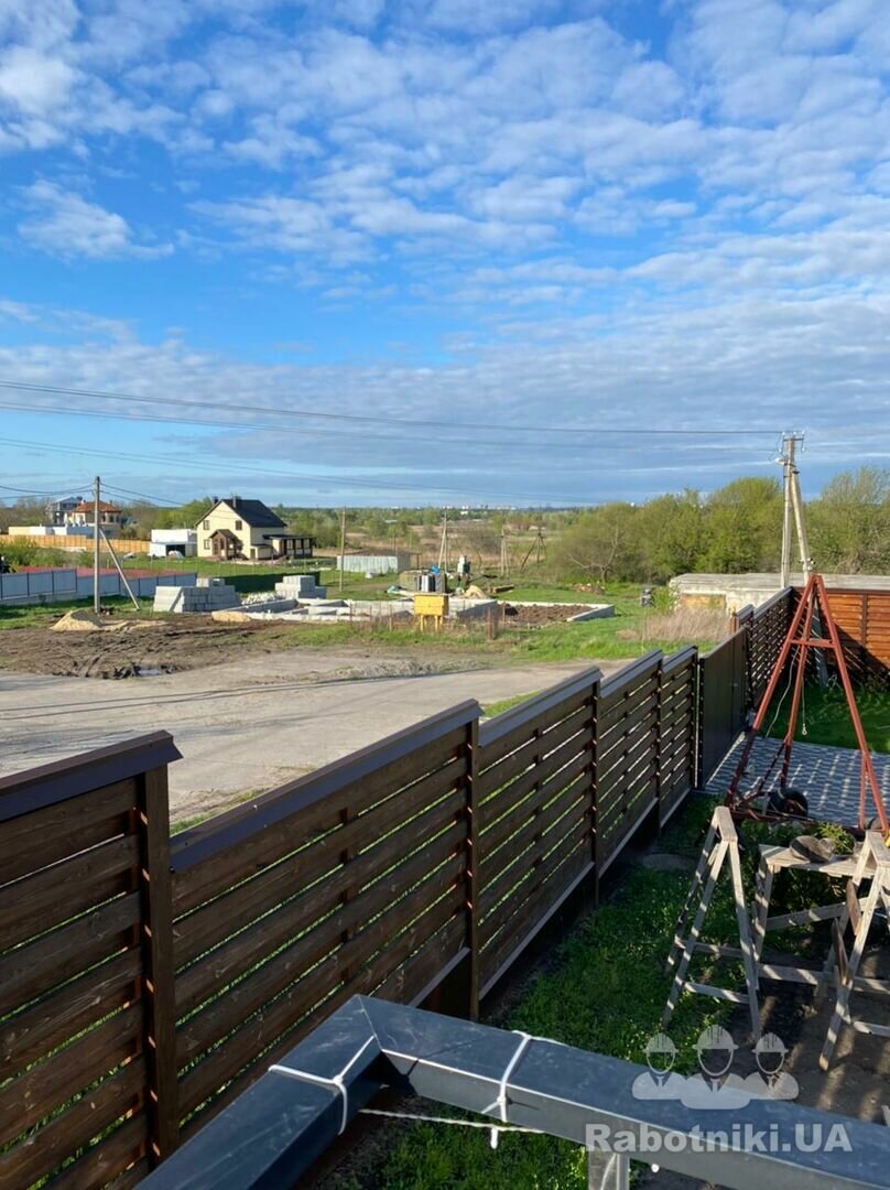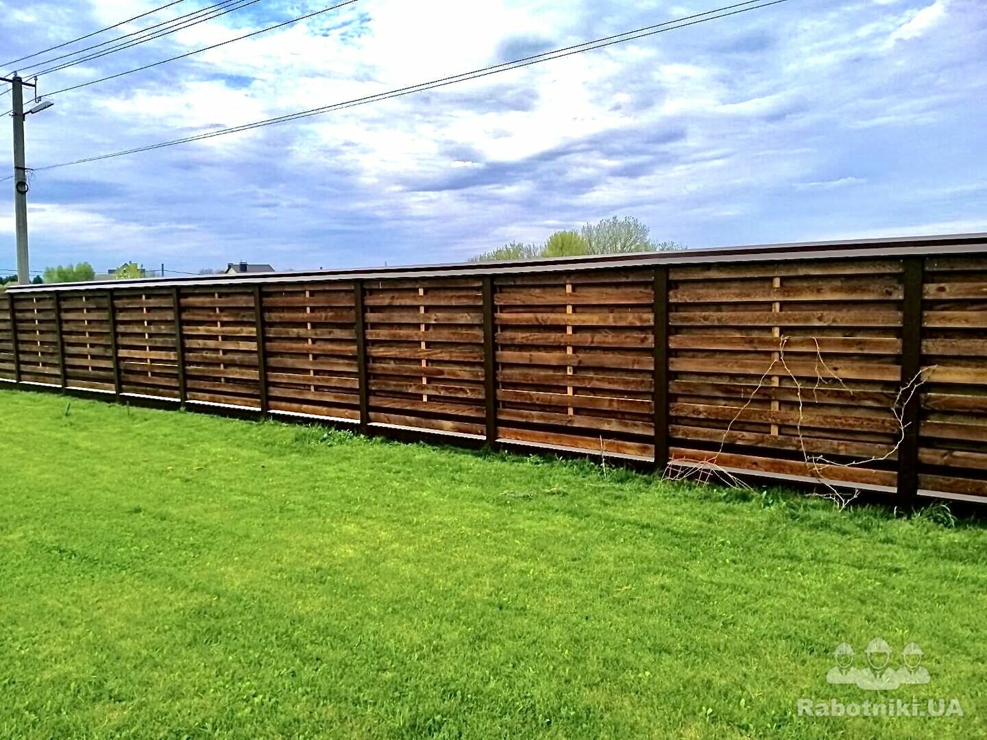 Необхідно побудувати дерев'яний паркан на схилі, розмір секції 3м.на 2.5 м. Контрукція, профтруба з зашивкою дошкою 3м на 0.12 м на 0.02. Зверху встановлений капельник, нижній ряд підшивка металом. Довжина 50 метрів, 17 секцій. Фото аналогічного паркану додаю.