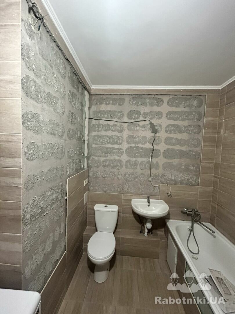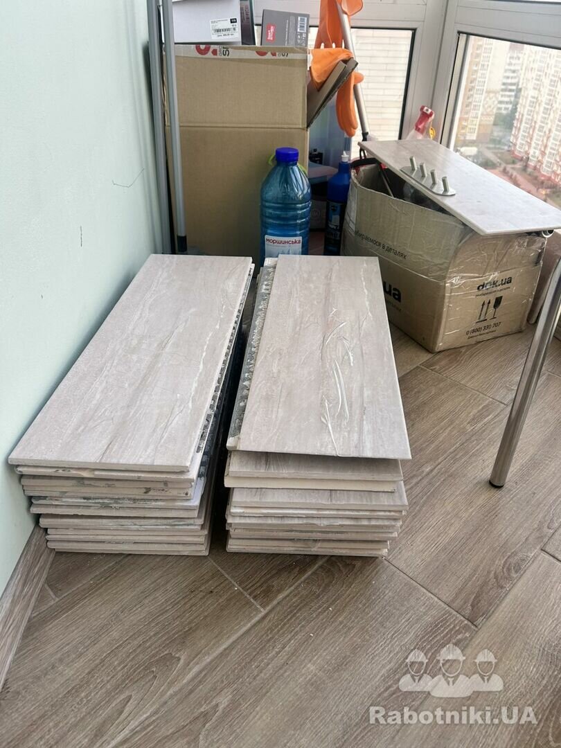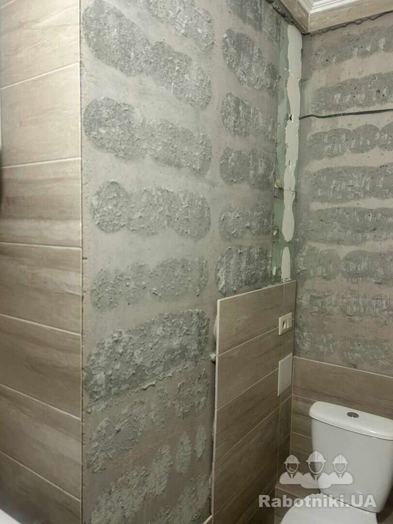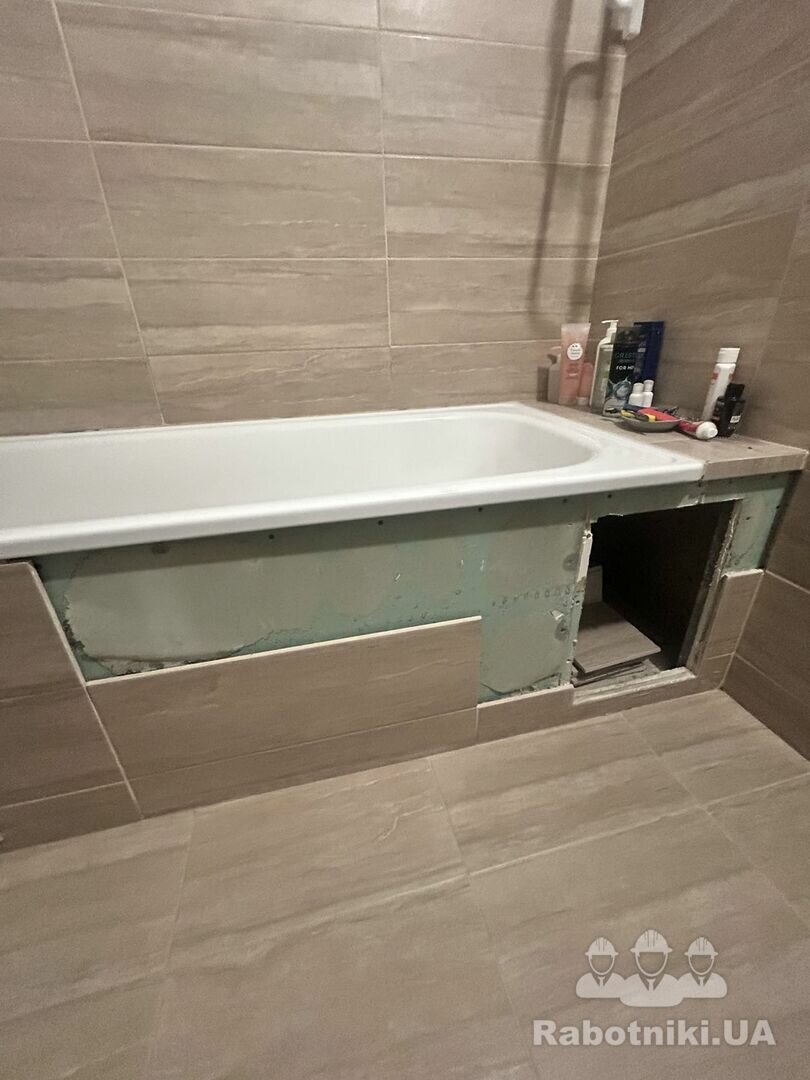 В ванній кімнаті по 2х стінах і на фартусі ванної зсунулась плитка, яка була демонтована і яку тепер необхідно покласти знову і затерти шви. Попередньо необхідно прогрунтувати поверхні. Площа, що потребує укладки 5,5 м2. Потрібно закупити необхідні матеріали. Інструменти майстра. Фото поверхонь для укладання та фото знятої плитки додаються.