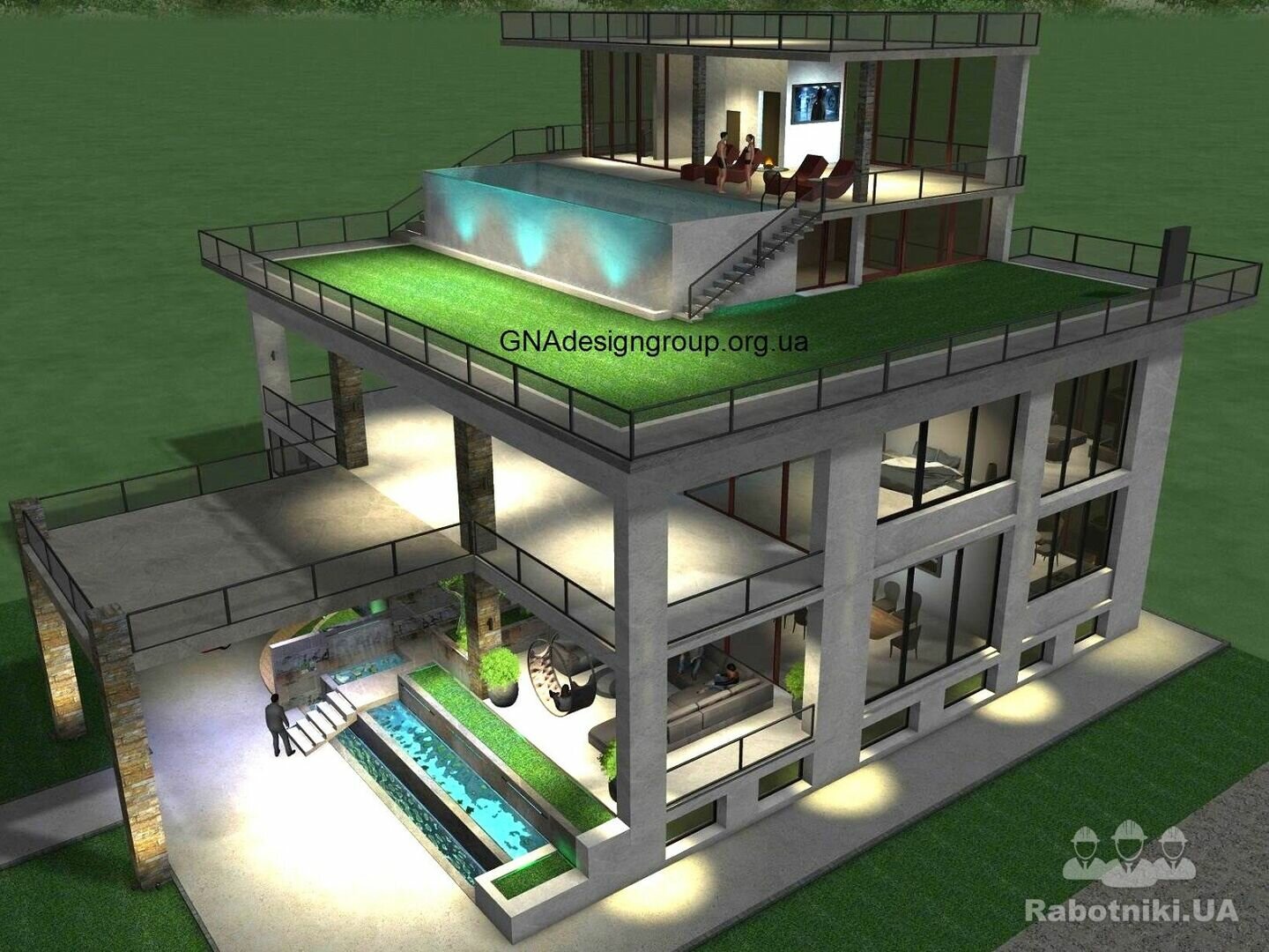 (моделювання будівлі, різні варіанти дизайна фасадів, освітлення, 3д візуалізація і т.д.)