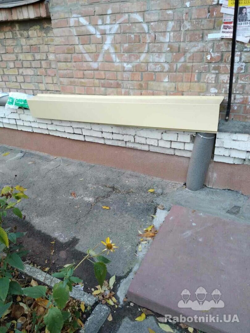По фасаду 5-поверхового будинку прокладено трубу у теплоізоляції. Необхідно встановити (монтаж) коробу з 25 карнізів по 2 м довжини кожний (див. фото). Надаючи пропозицію вкажіть: термін виконання, інструмент, що у вас є для виконання робіт. Оплата переважно безготівкова