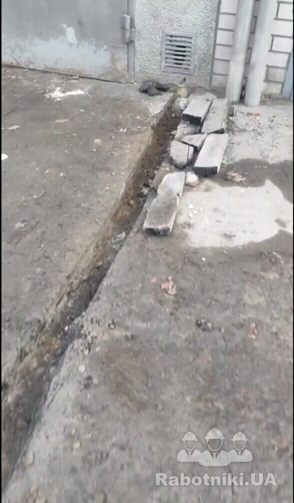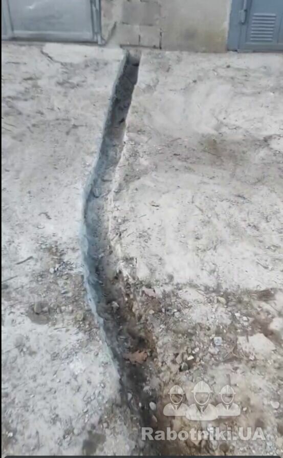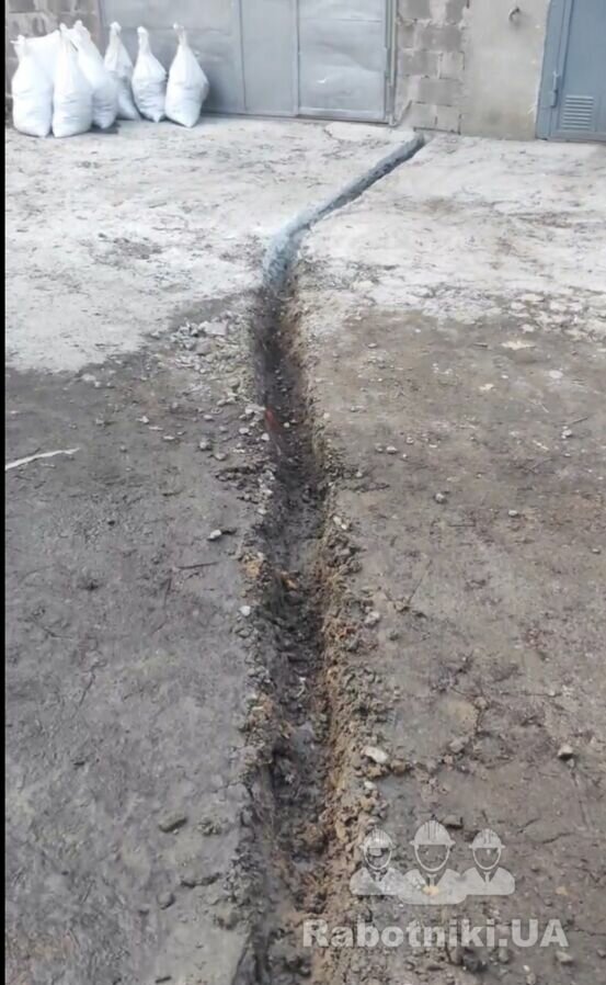 Траншея для труб під кабель, довжина 10м. Потрібно углубитись на 40-50 см. Щоб заложити 3 труби 32 діаметр, завести труби, забетонувати. Тут щебінь з землею, але є трохи бетону (потрібен відбійник + підрізка бетону якщо потрібно).